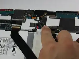 Соединение между аккумулятором и платой представляет собой группу из четырёх проводов в чёрной крышке, расположенную примерно в верхней средней части устройства. Используя пластиковую лопатку или плоский тонкий инструмент, поднимите чёрный разъём вверх, чтобы отключить его.