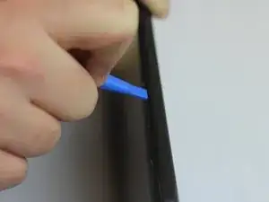 С помощью пластикового инструмента для открывания начните с центра и вставьте угловой конец между пластиковой задней панелью и экраном.