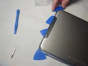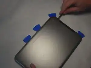 Вставьте синие медиаторы в щель между верхней и нижней панелями, начиная с того же конца, что и слот Micro SD.