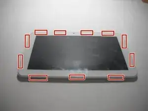 Если между экраном и задней крышкой не образуется небольшой зазор, аккуратно отожмите вверх в каждой из этих точек защёлки.