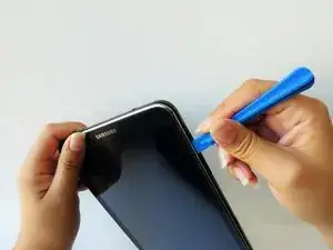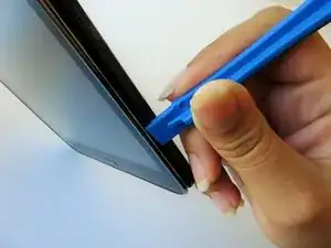 В верхней части планшета вставьте синий пластиковый инструмент для открытия между задней пластиковой крышкой и металлическим ободом передней панели.