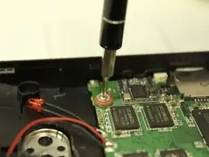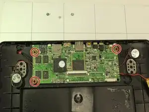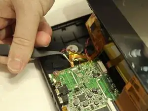 У материнской платы припаяны соединения с аккумулятором, динамиками и светодиодом индикатора зарядки. Будьте осторожны при извлечении материнской платы с задней крышки, так как эти элементы будут отсоединены вместе с ней.