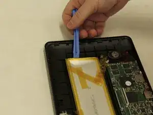 Для начала вставьте пластиковый инструмент для вскрытия между дисплеем и задней крышкой и приложите усилие, пока задняя крышка не отойдет от корпуса устройства.