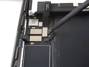Используйте плоский конец лопатки, чтобы приподнять и отсоединить оба нажимных разъёма кабеля дигитайзера.