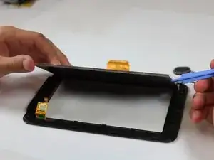 Пластиковым инструментом для открывания аккуратно подденьте чёрные крючки, оттягивая их от краёв серебристого ЖК-дисплея. Затем снимите ЖК-дисплей с передней панели.