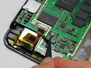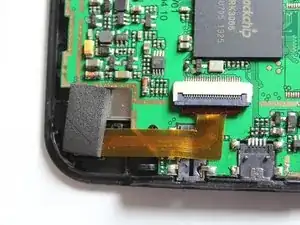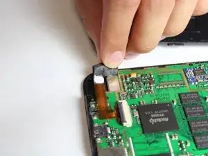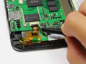 Пинцетом поднимите серый разъём, расположенный рядом с батареей и динамиком, из бежевого корпуса. Он должен повернуться вверх, что позволит выдвинуть шлейф из-под разъёма.