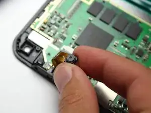 Пинцетом поднимите серый разъём, соединяющий шлейф камеры с платой, из бежевого корпуса. Он должен повернуться вверх, что позволит выдвинуть шлейф из-под разъёма.