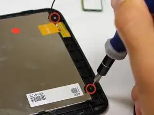Каждый винт прижимает чёрную защёлку к серебристому ЖК-дисплею. После снятия винтов эти защёлки отпадут.