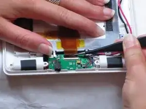 На противоположном конце устройства: снимите шлейф между динамиками в конце батареи.