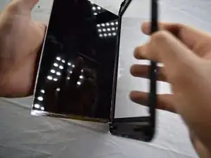 Батарея приклеена к узлу дисплейной панели двусторонним скотчем. Убедитесь, что вы тянете батарею уверенно.