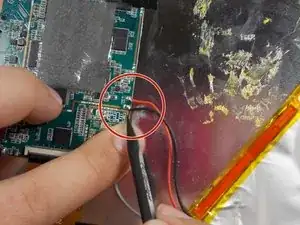 Отпаяйте красный и чёрный провода, соединяющие батарею с платой.