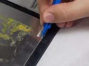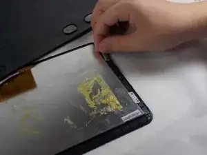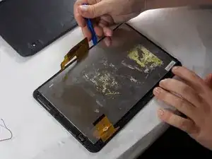 Используйте инструмент для вскрытия, чтобы аккуратно отстегнуть заднюю крышку от планшета. Начните с того места, где вы поддeли ногтем, и продвигайтесь по всем четырём сторонам устройства.
