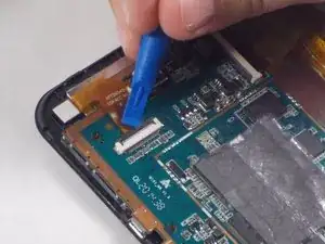 Используйте большой палец или инструмент для вскрытия, чтобы приподнять чёрный разъём, фиксирующий гибкий кабель.