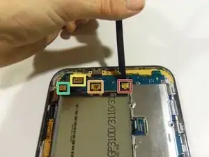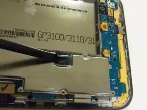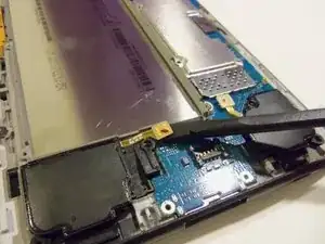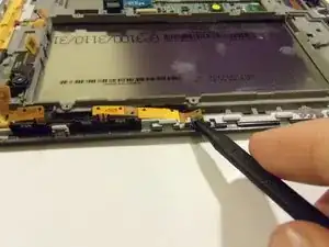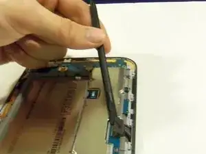 С помощью пластикового монтажного инструмента отсоедините гибкий кабель сенсорного экрана от его разъёма.