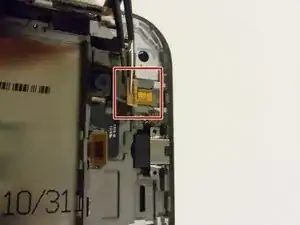 Ещё один гибкий кабель нужно снять — он расположен справа от разъёма фронтальной камеры (см. предыдущее изображение с выделенным жёлтым прямоугольником). Он соединяет верхний микрофон и разъём для наушников.