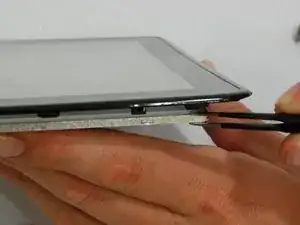 Начните с угла и отогните одну из чёрных защёлок. Одновременно попытайтесь попасть под экран пинцетом.