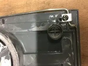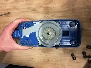 Заблокируйте мотор отверткой, чтобы иметь возможность открутить центральный винт, иначе к нему не добраться без блокировки шестерни.