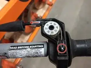Для сборки устройства выполните эти инструкции в обратном порядке. Наденьте чехол на новый тросик после протягивания тросика через направляющую втулку. Зажим установите посередине тросика в последнюю очередь, когда оба конца будут закреплены.