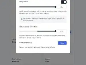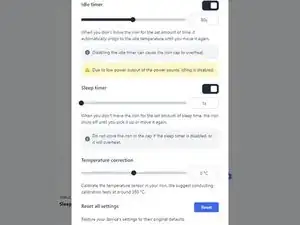Settings позволяет изменить настройки паяльника, такие как температура в режиме ожидания и таймер сна.