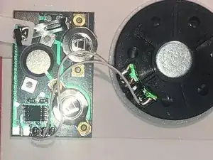 У этой музыкальной открытки два основных компонента: плата с микросхемами для музыки, батареями и т.п., и динамик.