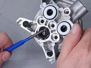 Используйте отвертку, чтобы поддеть и вынуть три канавчатые кольца из цилиндров поршней.