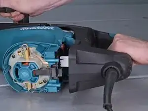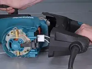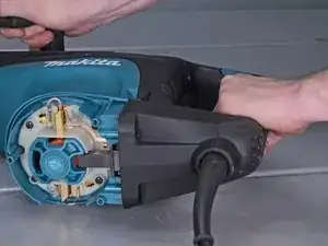 Оттяните узел рукоятки от молотка, но пока не снимайте полностью. Он всё ещё подключён к молотку силовым кабелем.