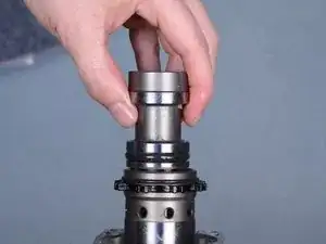 При сборке цилиндр должен будет надетьcя на поршень, который находится на дне алюминиевого корпуса. Убедитесь, что поршень центрирован и направлен строго вверх, чтобы он полностью вошёл в цилиндр.