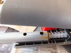 Серебристый стержень с двумя отверстиями — это ручка швабры. Она присоединяется к поршню/штоку насоса. Учтите это при последующей сборке.