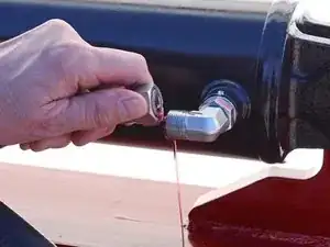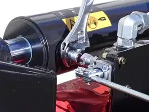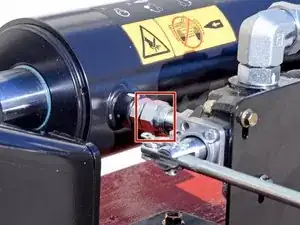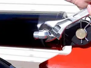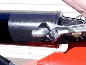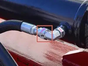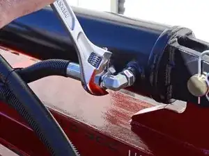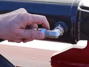 Используйте разводной ключ, чтобы ослабить гайку, фиксирующую шланг удлинения поршня к угловому штуцеру на боковой стороне цилиндра.