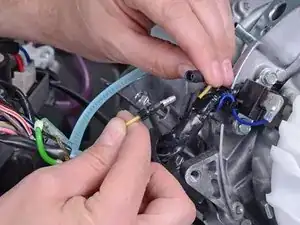 Используйте плоскую отвертку, чтобы поддеть синий жгут проводов от нижней крышки.