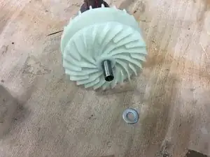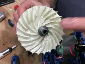 Зафиксируйте двигатель отверткой, чтобы выкрутить центральный винт — без блокировки шестерни это сделать нельзя.