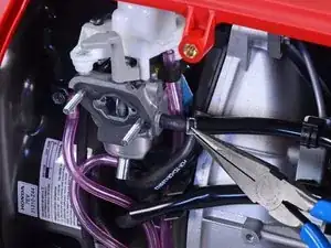 Используйте плоскогубцы, чтобы сжать и сдвинуть пружинный хомут с топливного входа карбюратора.