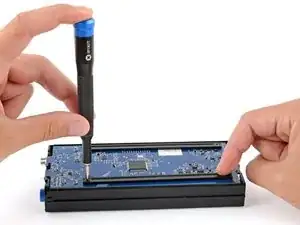 Используйте отвертку Torx T10, чтобы выкрутить два винта длиной 8 мм, фиксирующие заднюю крышку.