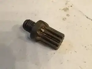 Снимите шестерню привода. Я зажал сборку в деревянных тисках и аккуратно использовал небольшой трубный ключ, чтобы открутить шестерню. Требовалось небольшое усилие, чтобы шестерня начала отворачиваться. Если не откручивается легко, попробуйте обработать WD-40, подождите и попробуйте снова.