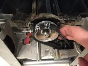 Двумя руками аккуратно снимайте приводной ремень, следя, чтобы не защемить пальцы. Сначала надавите на заднюю часть ремня правой рукой и аккуратно проверните шкив левой. Когда дойдёте до середины, переместите правую руку на переднюю часть шкива и надавите вниз. Действуйте медленно.