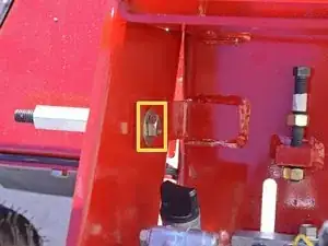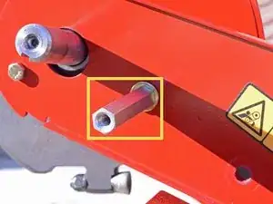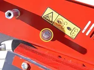 Используйте торцевой ключ 1/2 дюйма, чтобы выкрутить болт рядом с валом режущего колеса, фиксирующий защитную пластину к раме.
