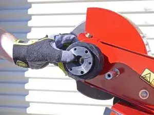 Наклоните машину так, чтобы она опиралась на ручку, а режущий диск был приподнят.