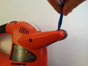 С помощью пластикового инструмента отверьте фиксатор ручки, как показано.