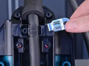 При сборке зацепите правый край пластины закрепления кабеля под выступ справа от шнура перед тем, как прижать её на место и снова установить винт с крестообразной шлицем.