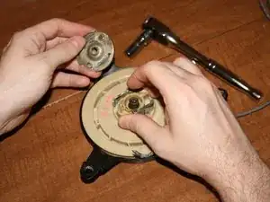 После снятия стартера открутите крышку, которая удерживает шкив на корпусе стартера.
