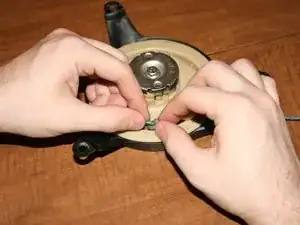 После отвёртки снимите металлическую деталь, которая снимает натяжение с катушки.