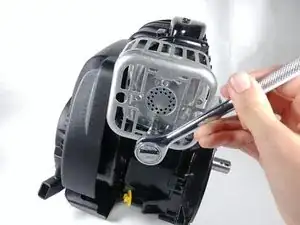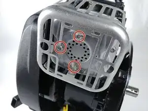 Используя головку на 6,35 мм и ручной трещоточный ключ, ослабьте три винта, удерживающие térmозащиту коллектора выхлопных газов.