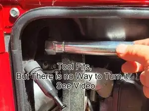 Поскольку оригинальный инструмент не подходит для откручивания или затяжки свечи зажигания, необходимо использовать стандартный ключ для свечей зажигания 13/16 дюйма, универсальный шарнир и удлинитель длиной 15 см, чтобы добраться до свечи и открутить или затянуть её. Оригинальным инструментом можно вращать свечу вручную после того, как она будет ослаблена