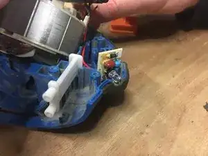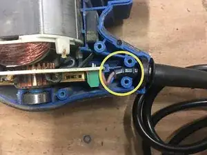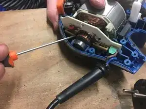 Поднимите угольную щётку и другим концом отвертки поверните маленький усик.