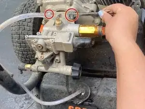 Поверните насос так, чтобы подводы шлангов располагались правильно, и отверстия для болтов совпадали с отверстиями на двигателе.
