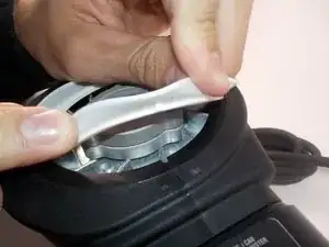 После нахождения белого пластикового кольца потяните за его внешний край, как показано. Внутренний выступ согнётся и освободится из фиксированного положения.