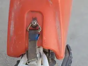 Отстегните эластичный ремень, расположенный на задней стороне бензобака.