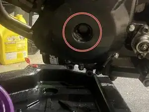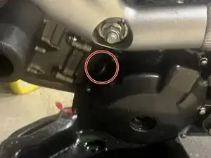 Найдите сливную пробку охлаждающей жидкости под шестигранник 10 мм. Она расположена на правой крышке двигателя, чуть ниже патрубка охлаждающей жидкости.