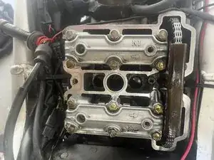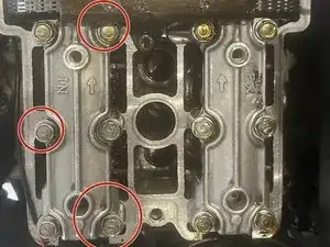 Используйте головку 10 мм и снимите винты, как показано на фотографиях. Это делается, чтобы избежать чрезмерного напряжения на крышке. Я ломал их раньше, не сделав этого (при установке), но это хорошая практика и при снятии. Повторите для обеих крышек.