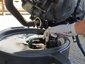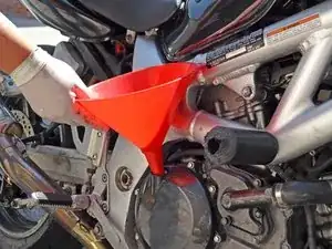 Залейте 3 кварты масла 10W-40 для мотоциклов в двигатель. Одной рукой стабилизируйте воронку, чтобы не пролить масло.